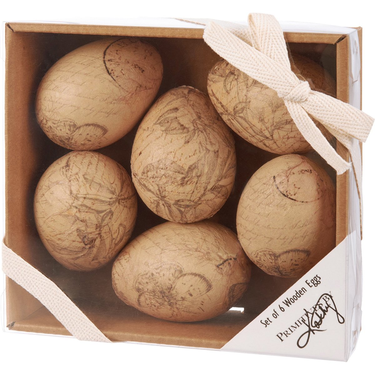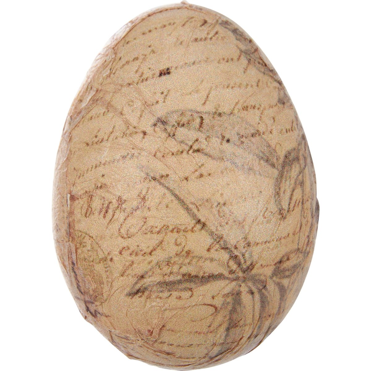 A set of 6 decorative wooden eggs from our Easter & Spring Collection displaying a vintage paper design wrapped around each egg for an antique aesthetic. Vintage paper features designs of butterflies, postal markings, and handwriting. Coordinates well with our French country inspired décor for an elegant display. Our Vintage Paper wooden eggs come packaged in a cardboard box with acrylic lid and cotton tape ribbon around corners.
