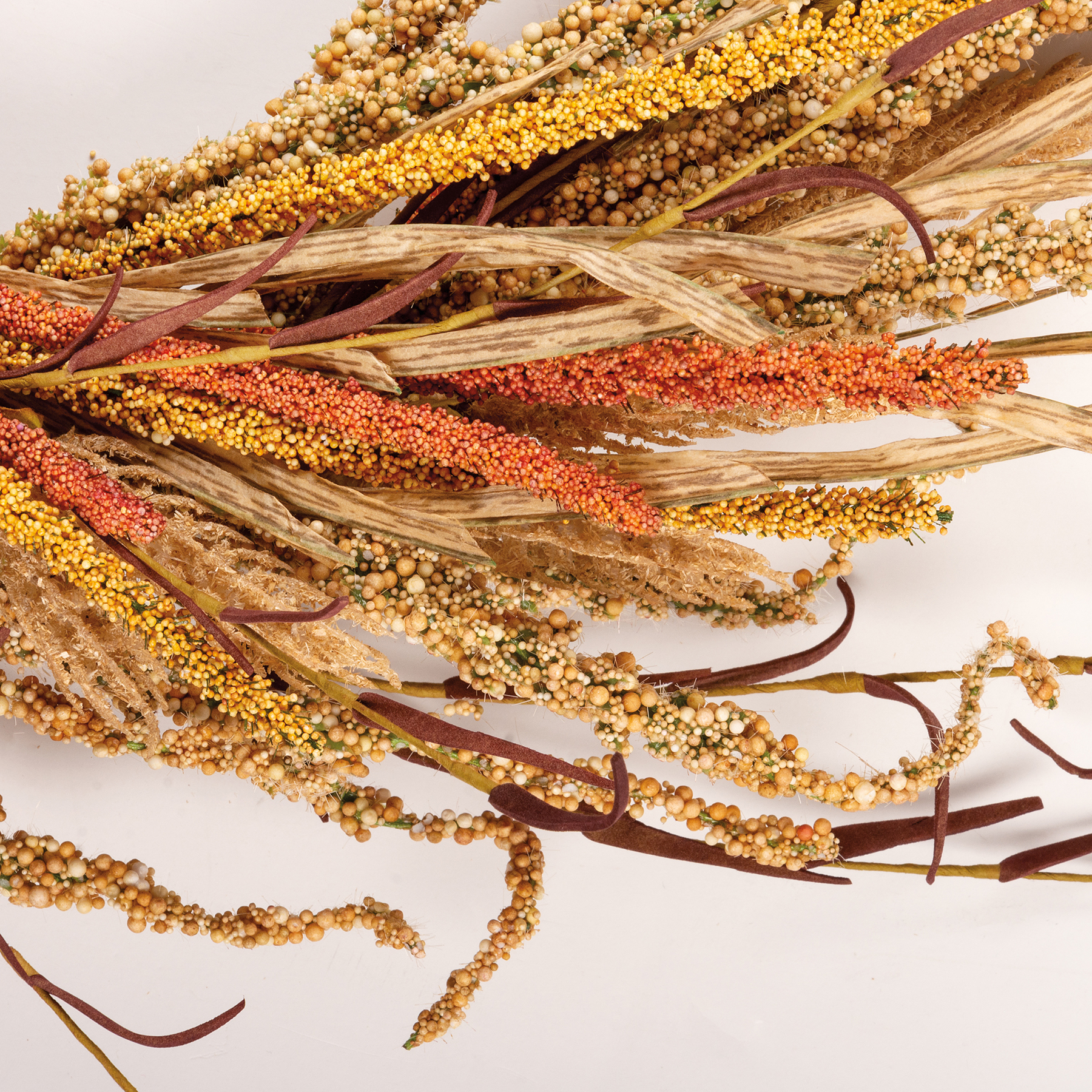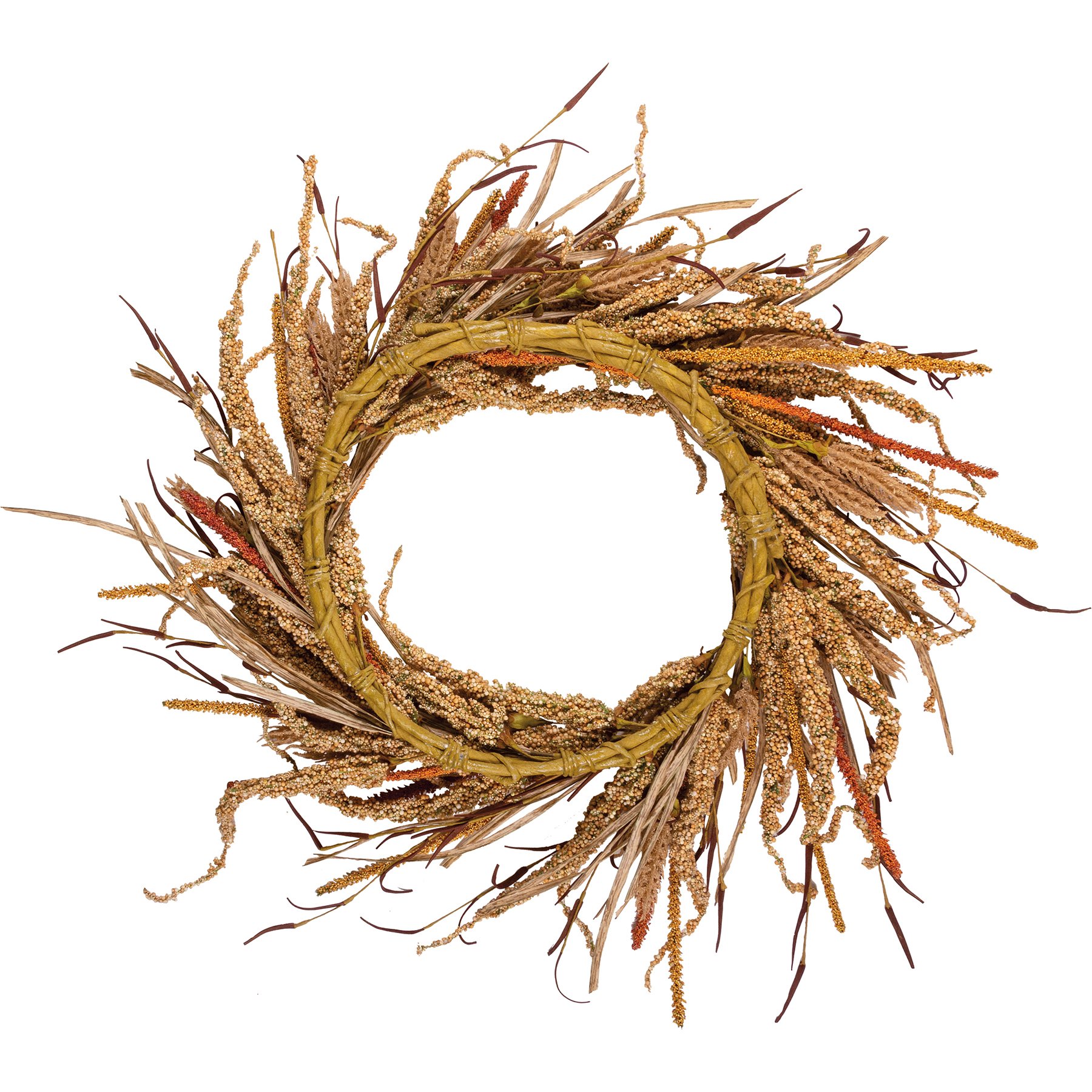 A decorative fall harvest wreath featuring natural foliage. Add one of our wreath inserts for a personal touch.