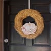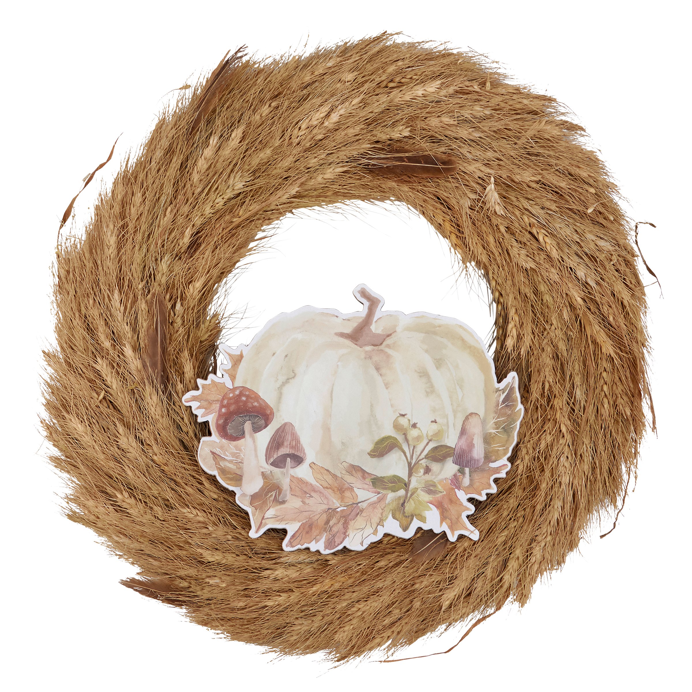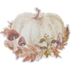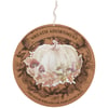A wooden wreath insert from our Fall & Harvest Collection featuring a hand painted design of a white pumpkin with fall foliage. Add a touch of personality to an otherwise plain wreath by simply fastening insert to wreath via attached wire or display on it's own as a seasonal home accent. Our Fall Pumpkin wreath insert is packaged on a cardstock disk with a cotton tape loop for easy display. A rustic seasonal home accent perfect for adding to any wreath.