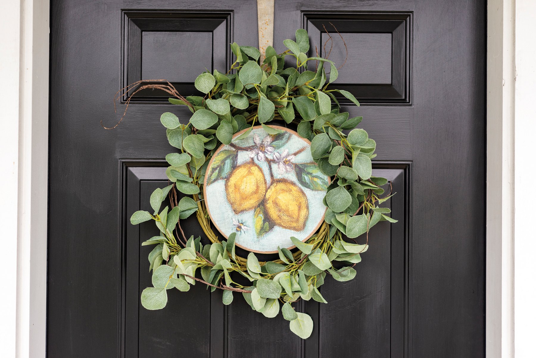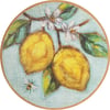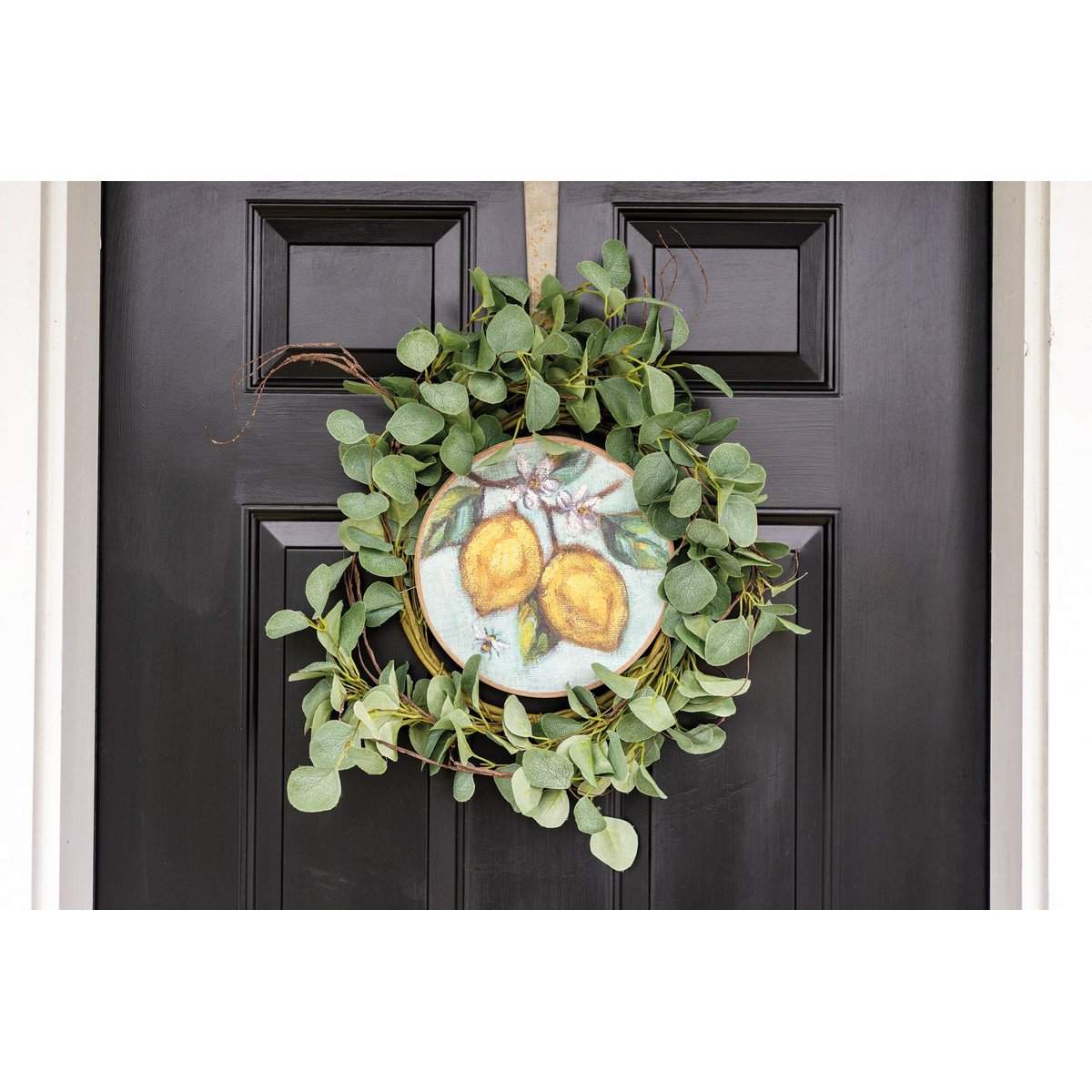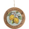 A wooden hanging décor piece featuring a replication of a painting of lemons hanging from a branch. Original painting features a unique textured effect from process of painting on burlap. Designs are printed directly onto the wood to preserve integrity of original artwork. Add a touch of personality to an otherwise plain wreath by simply fastening to wreath via attached wire, or hang alone on a wall or door by sawtooth hanger. Packaged on a cardstock disk with a cotton tape loop for easy hanging.