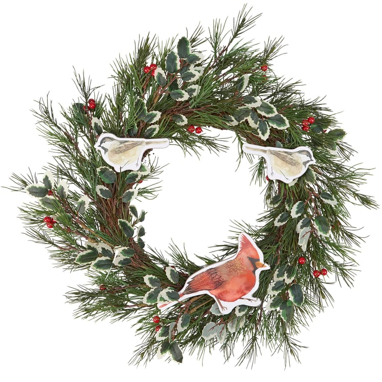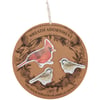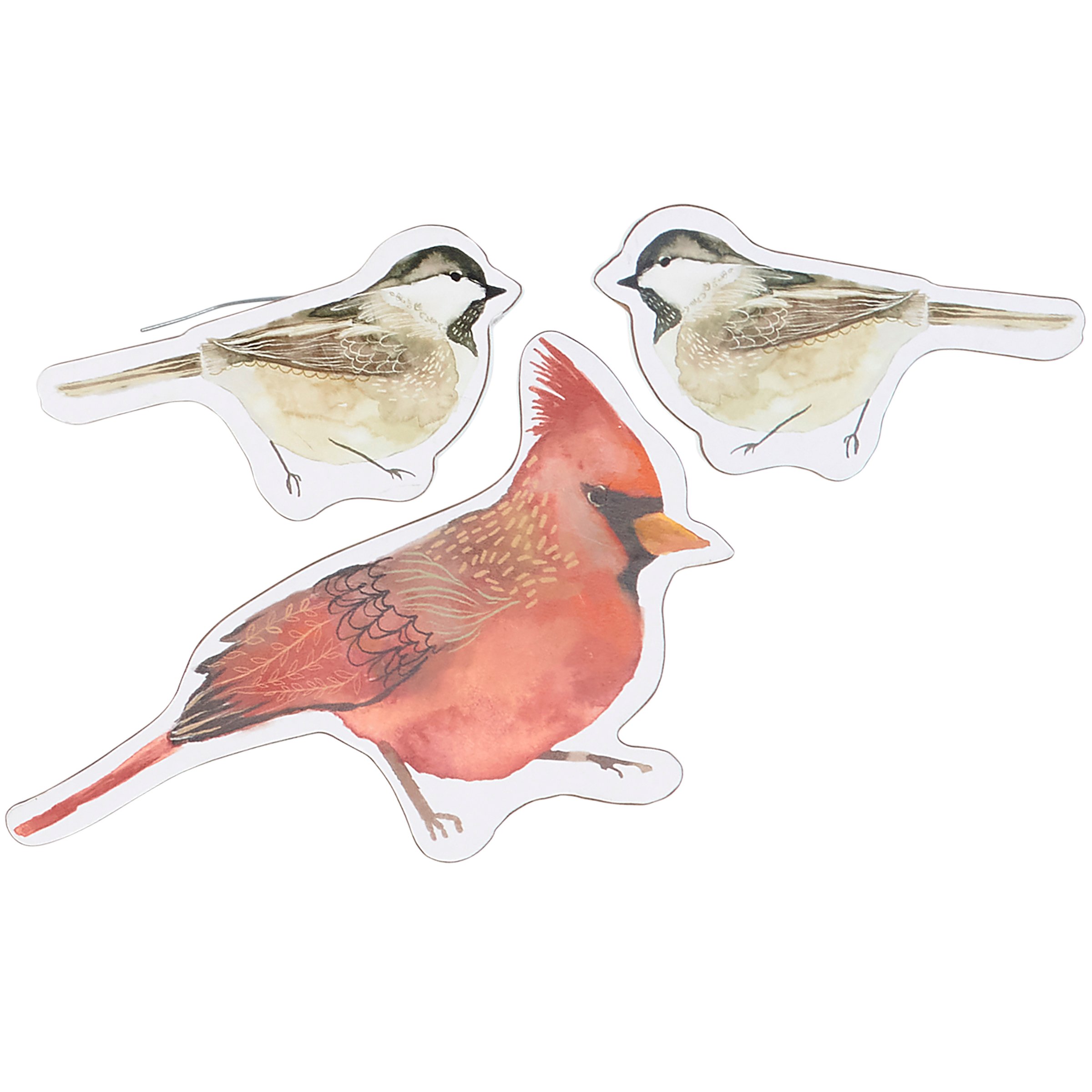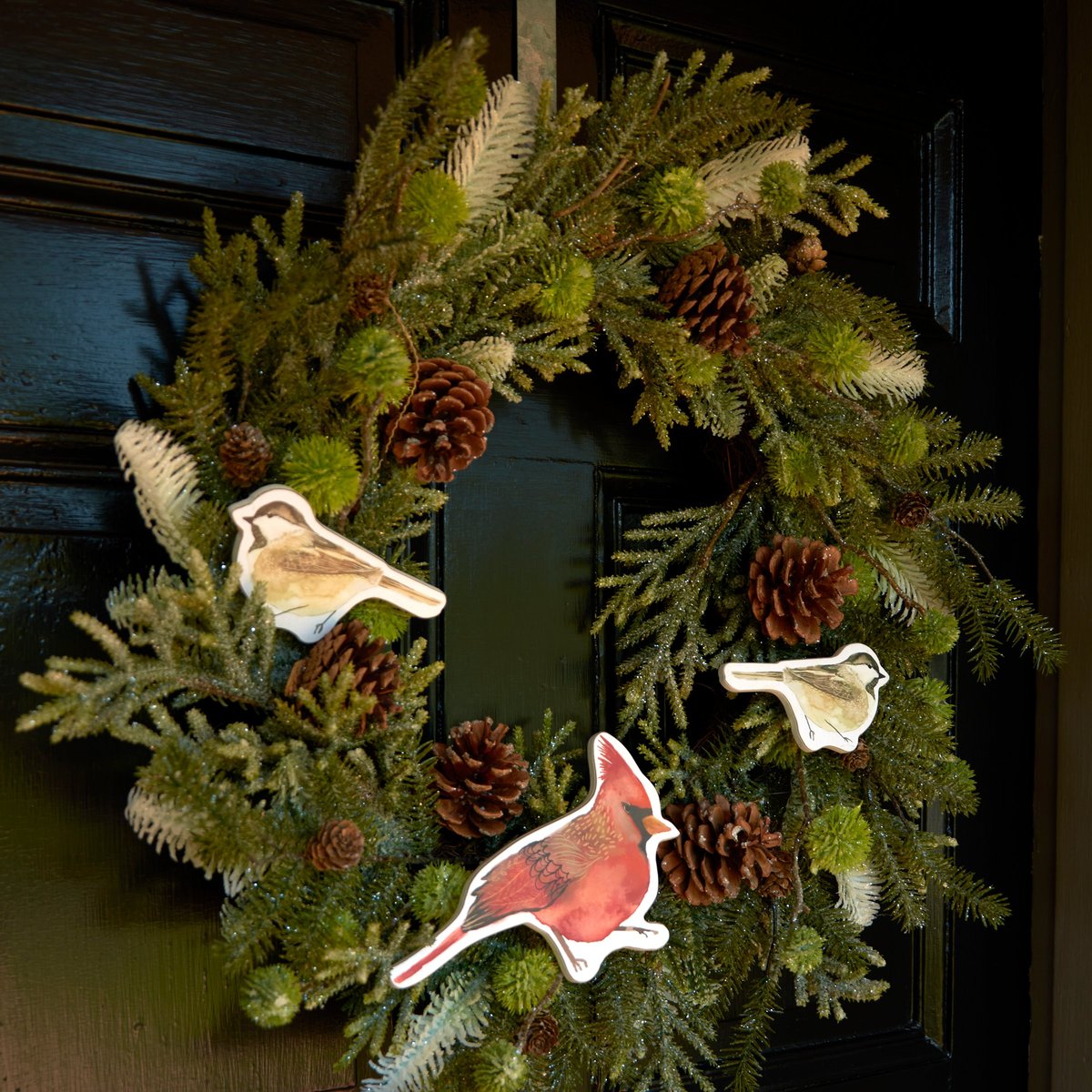 A set of three wooden wreath inserts from our Christmas Collection featuring hand painted designs of a cardinal and winter birds. Add a touch of personality to an otherwise plain wreath by simply fastening inserts to wreath via attached wire or display as seasonal home accents. Our Birds wreath insert set is packaged on a cardstock disk with a cotton tape loop for easy display. A set of rustic seasonal home accents perfect for adding to any wreath.