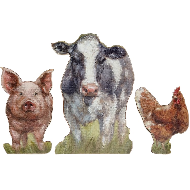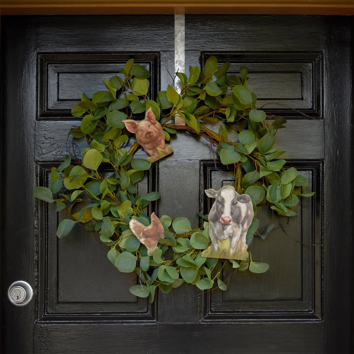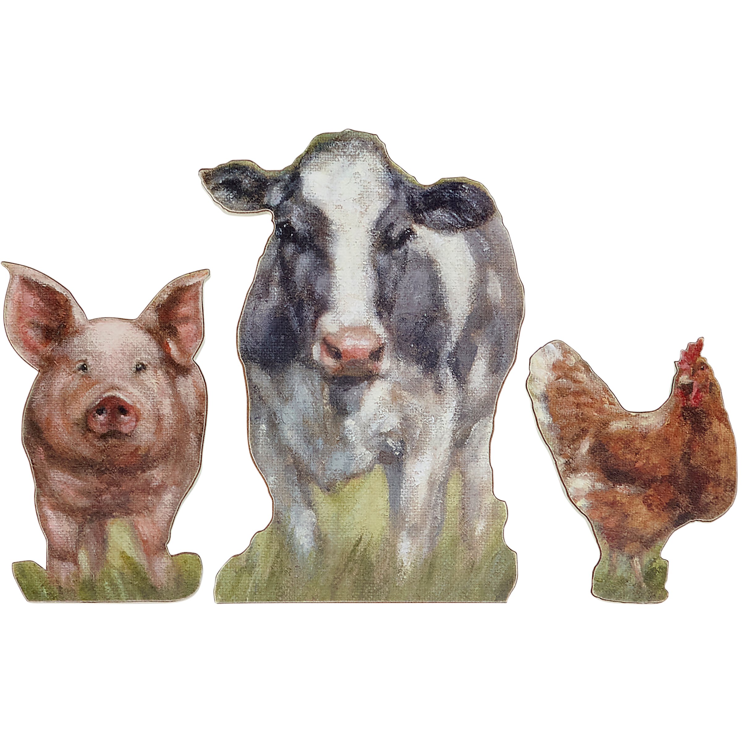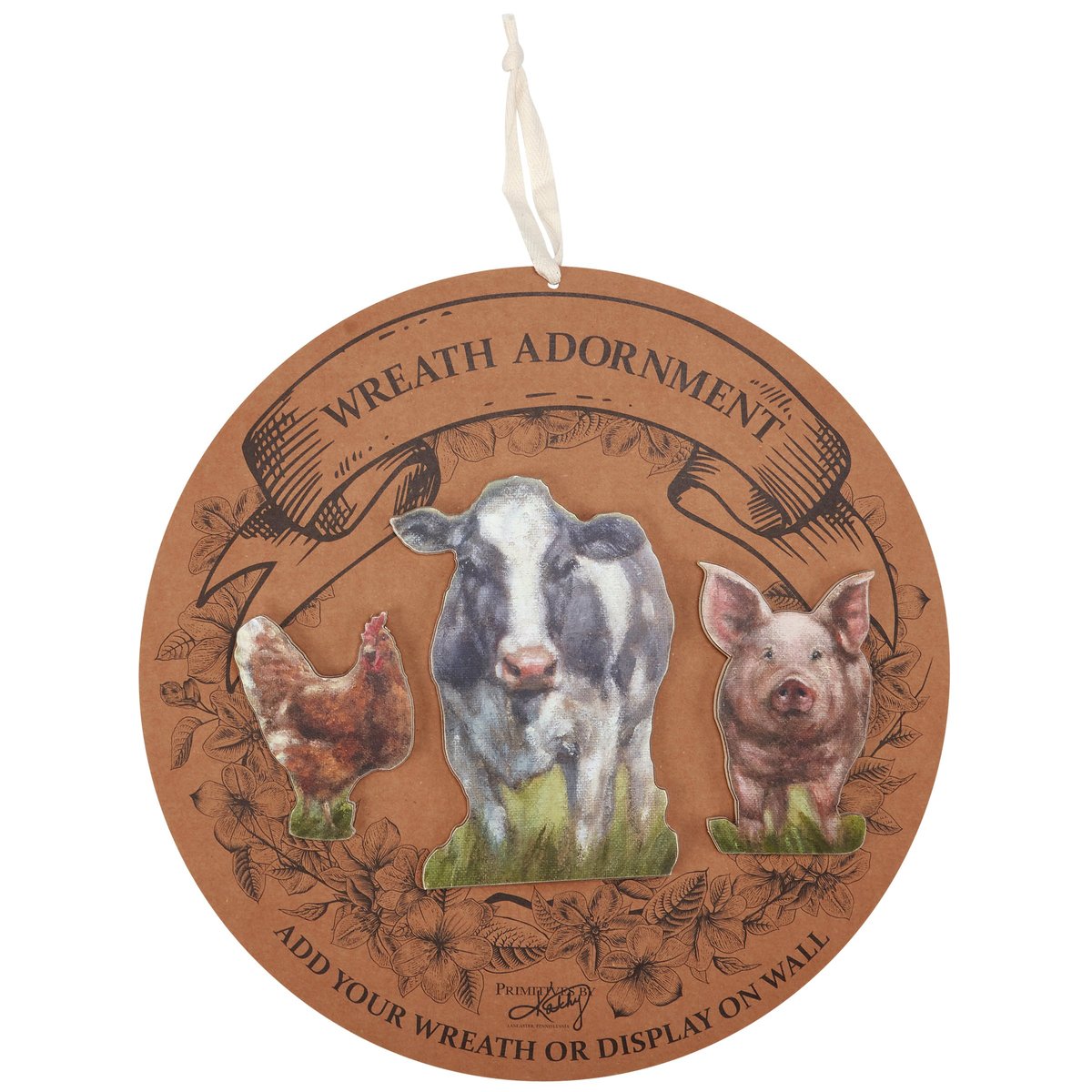 A set of three wooden wreath inserts from our Farmhouse Collection featuring hand painted designs of a cow, pig, and chicken replicated from original artwork painted onto burlap canvas, giving the art a unique depth and texture. Add a touch of personality to an otherwise plain wreath by simply fastening inserts to wreath via attached wire or display as everyday home accents. Our Farm wreath insert set is packaged on a cardstock disk with a cotton tape loop for easy display. A set of rustic everyday home accents perfect for adding to any wreath.