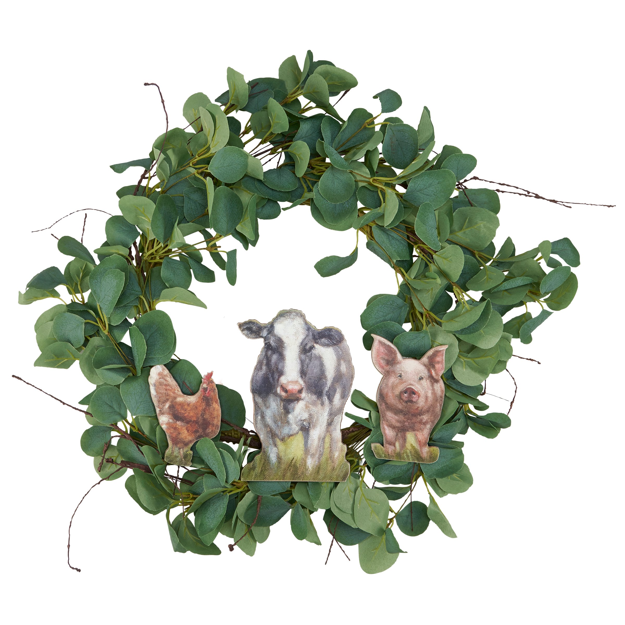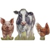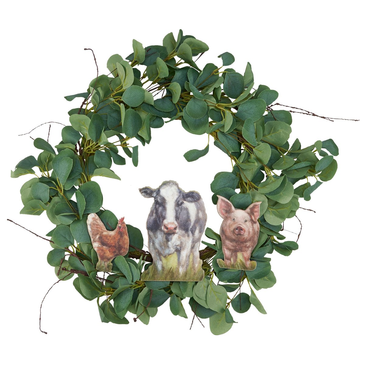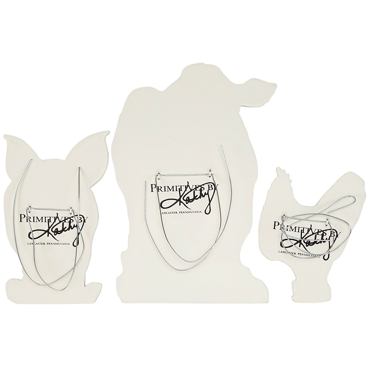 A set of three wooden wreath inserts from our Farmhouse Collection featuring hand painted designs of a cow, pig, and chicken replicated from original artwork painted onto burlap canvas, giving the art a unique depth and texture. Add a touch of personality to an otherwise plain wreath by simply fastening inserts to wreath via attached wire or display as everyday home accents. Our Farm wreath insert set is packaged on a cardstock disk with a cotton tape loop for easy display. A set of rustic everyday home accents perfect for adding to any wreath.