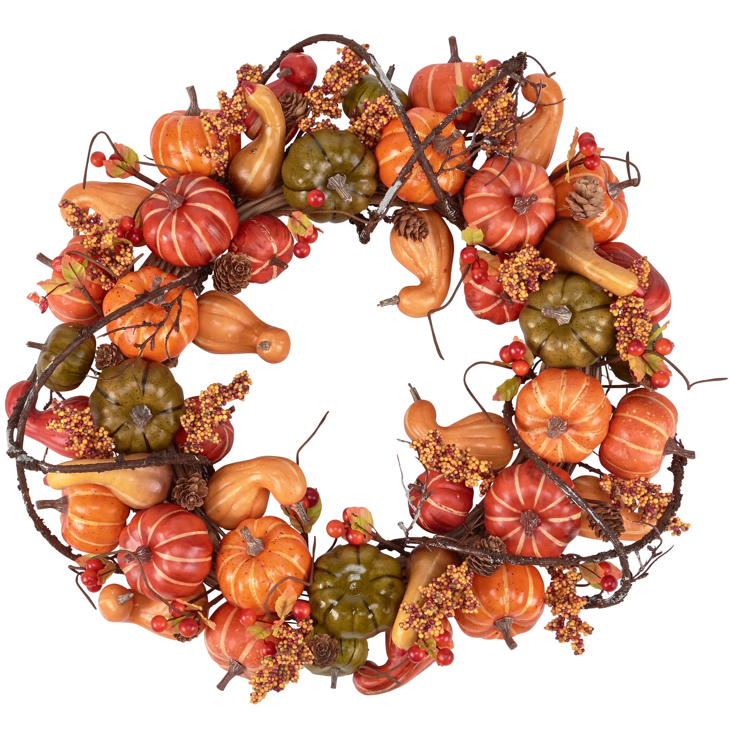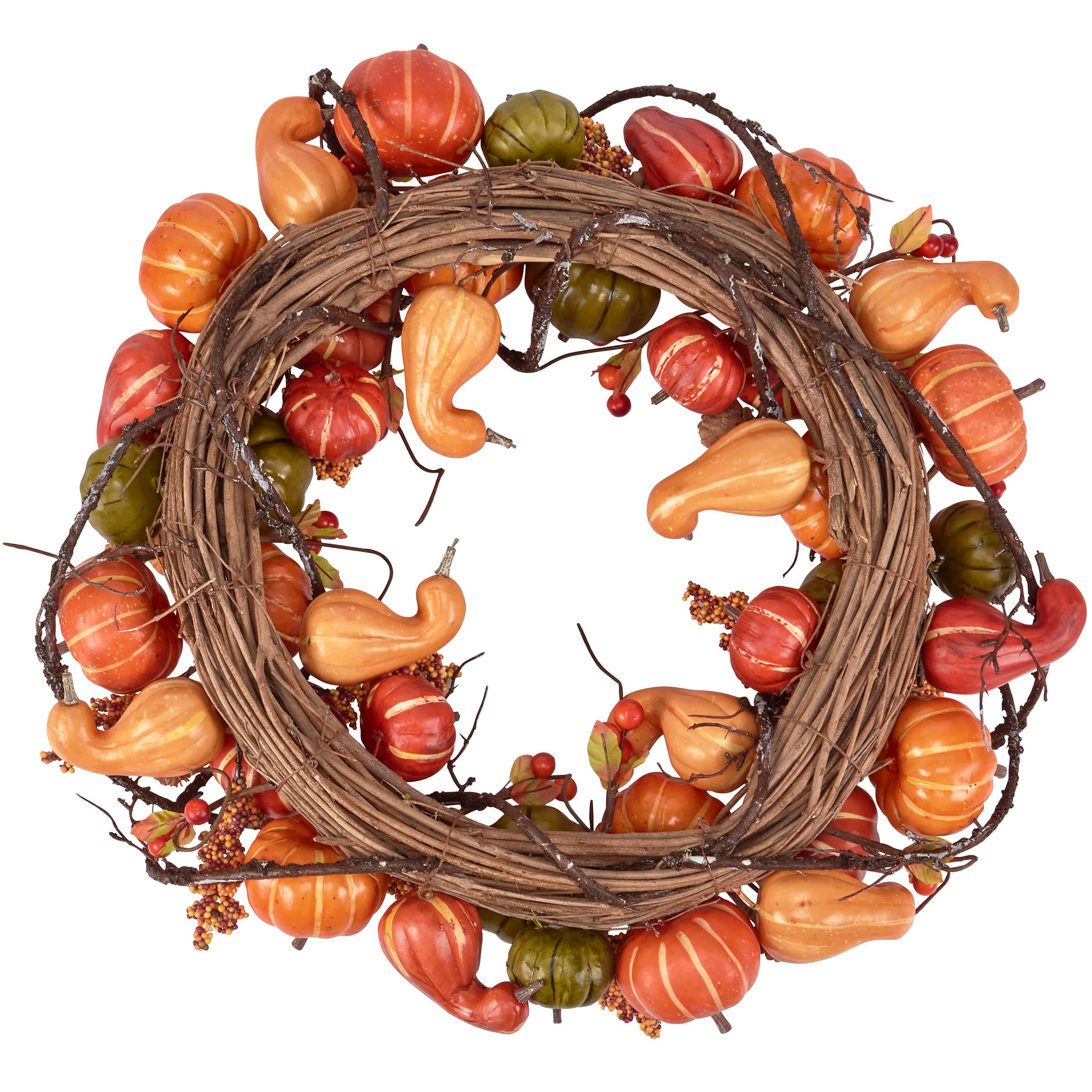 A decorative wreath from our Fall & Harvest Collection that adds a natural touch to seasonal home décor. Our Mixed Gourds wreath features a colorful combination of gourds and pumpkins with complementing fall foliage that coordinates well with almost any style, making it a perfect option for easily adding botanical accents to every space. Decorate with fall gourds for a colorful solution in seasonal displays and table settings. Easily hang on a door with our Galvanized Wreath Hanger. Displays perfectly on its own or enhance our mixed gourds wreath using one of our wreath inserts for a personal touch. A seasonal home accent with a variety of display options.