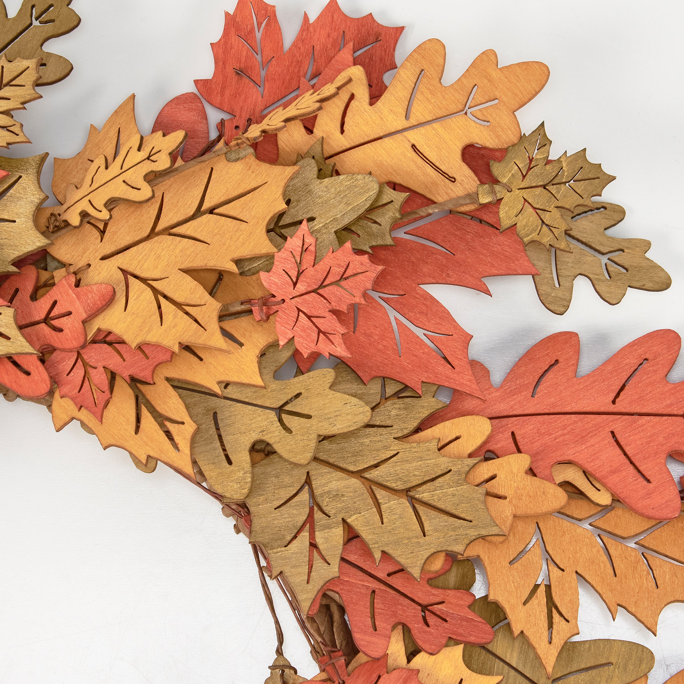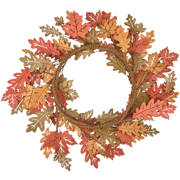 A decorative wreath from our Fall & Harvest Collection displaying wooden cutouts of oak and maple leaves in various autumn colors along a faux branch. Our Oak And Maple wreath easily hangs on a door with our Galvanized Wreath Hanger. Displays perfectly on its own or enhance seasonal wreath using one of our wreath inserts for a personal touch. A seasonal home accent with a variety of display options.