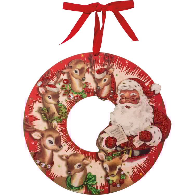 A vintage-inspired wooden wreath featuring reindeer and Santa Claus designs, glitter details, and top fabric loop for easy hanging.