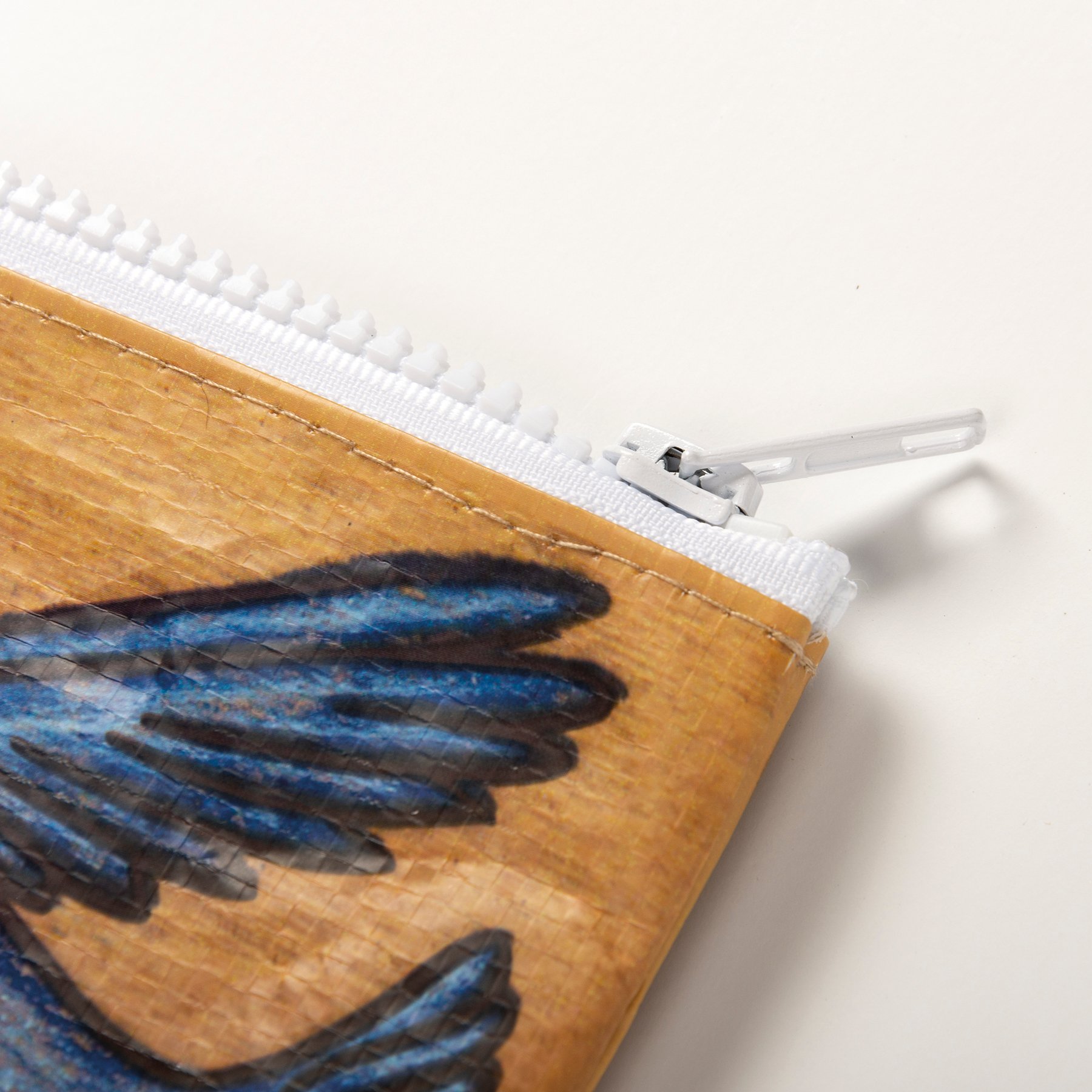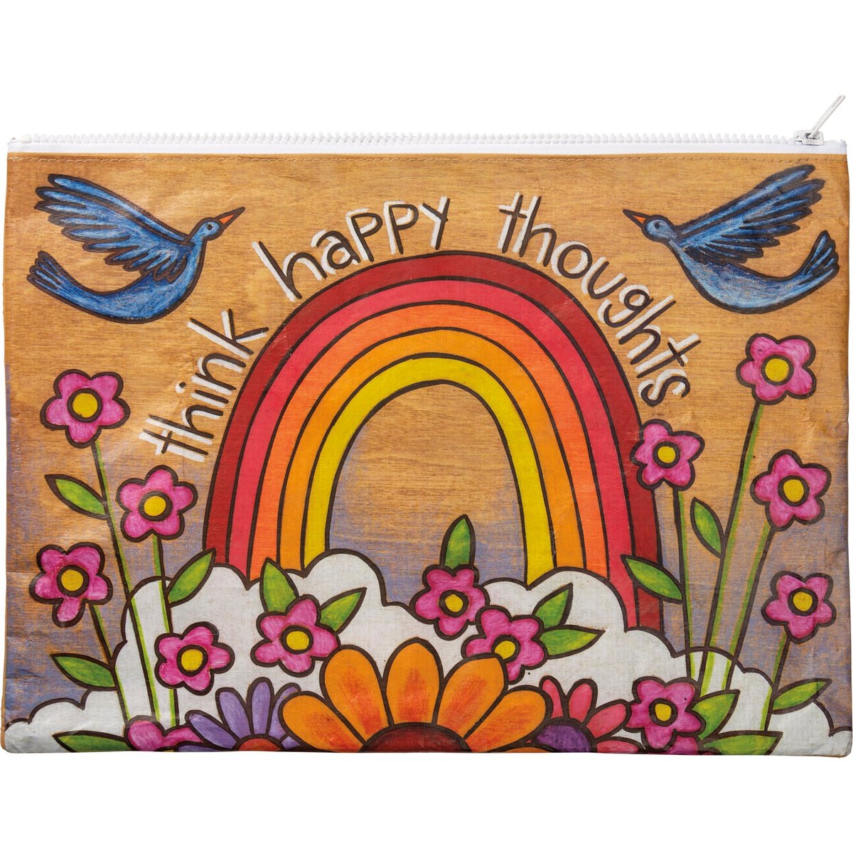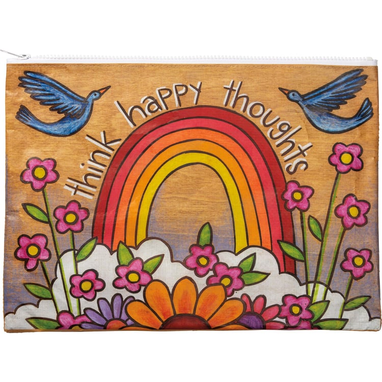 Made of post-consumer material, this double-sided zipper folder features vibrant wood burned designs and a "Think Happy Thoughts" sentiment. Includes top zipper closure.