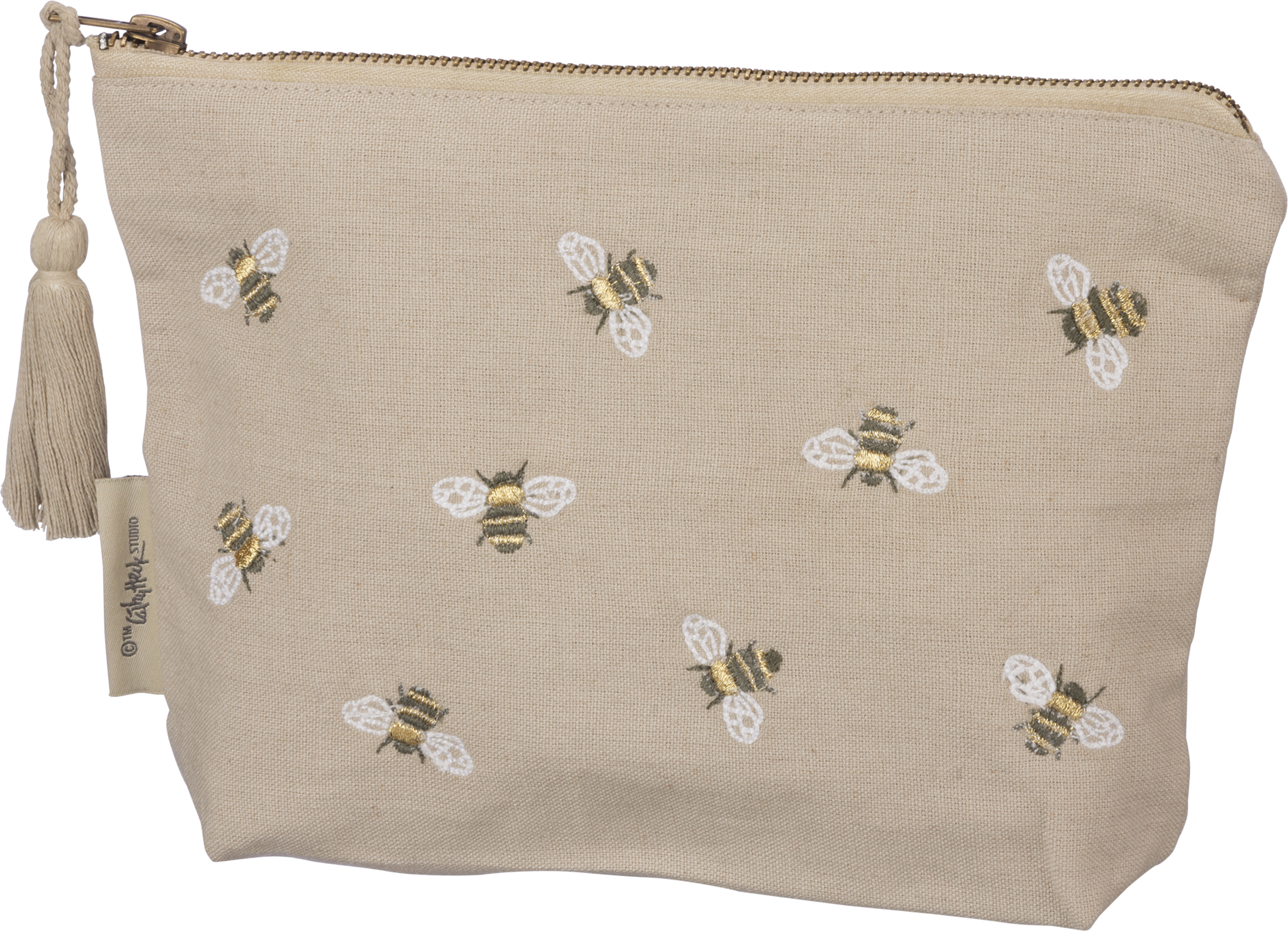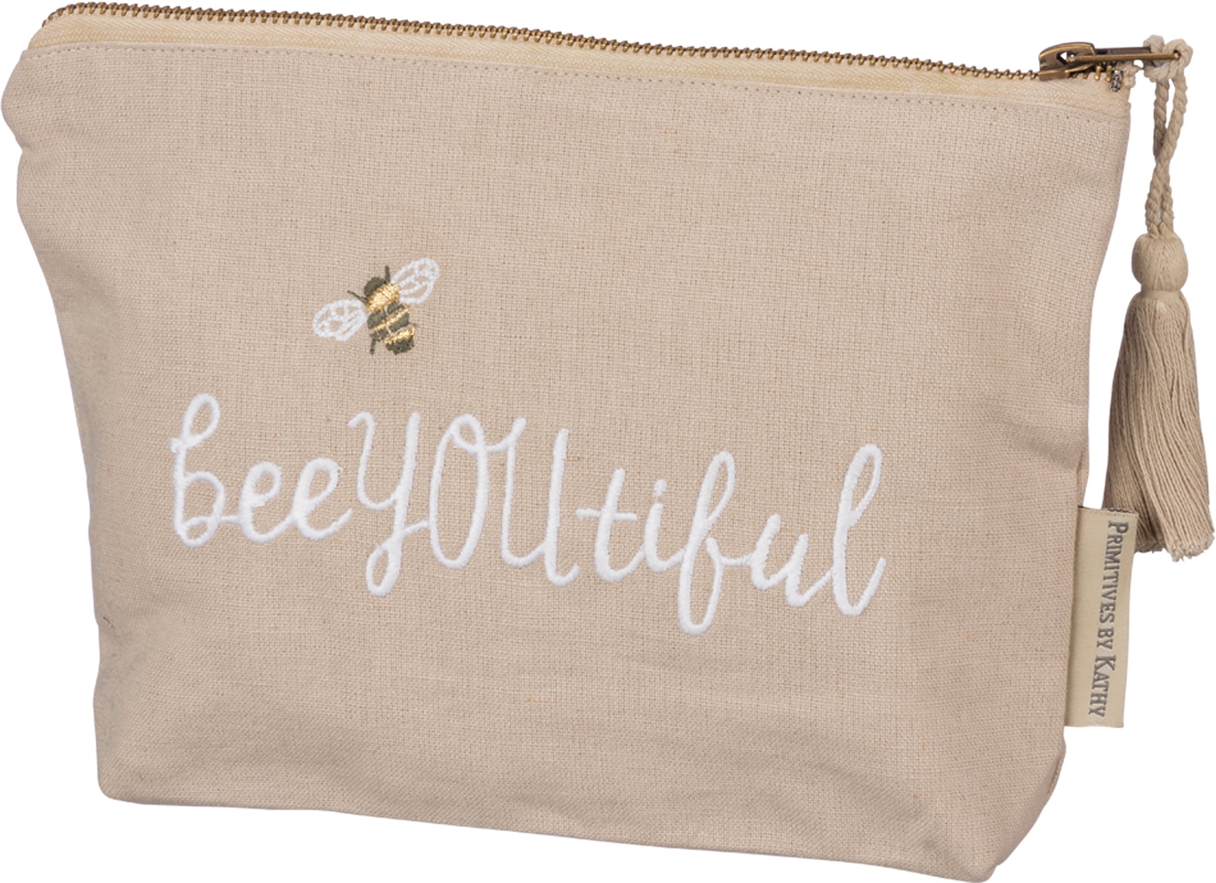 A cotton-linen blend pouch bag from our Garden Collection featuring an embroidered "BeeYouTiful" hand lettered sentiment, front and back stitched bumblebee designs, pops of metallic gold thread accents, and tassel detail. The Bee You Tiful zipper pouch has a top zip closure.