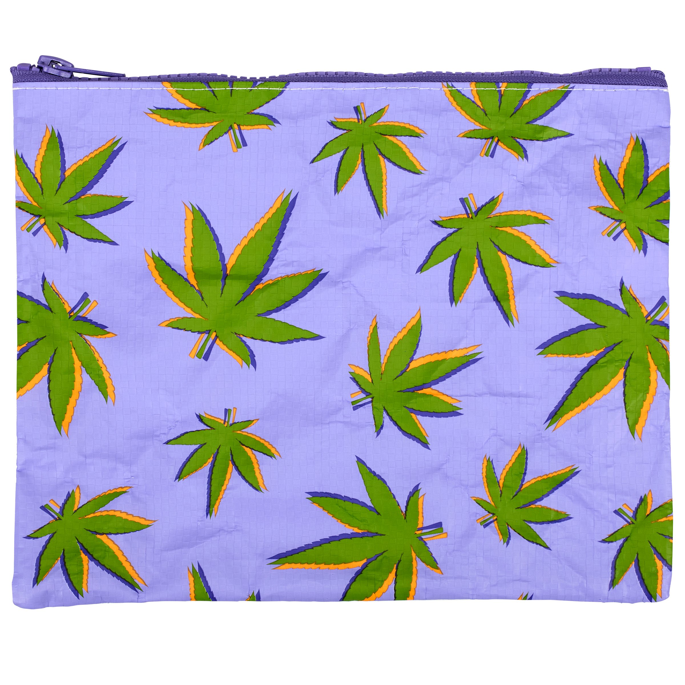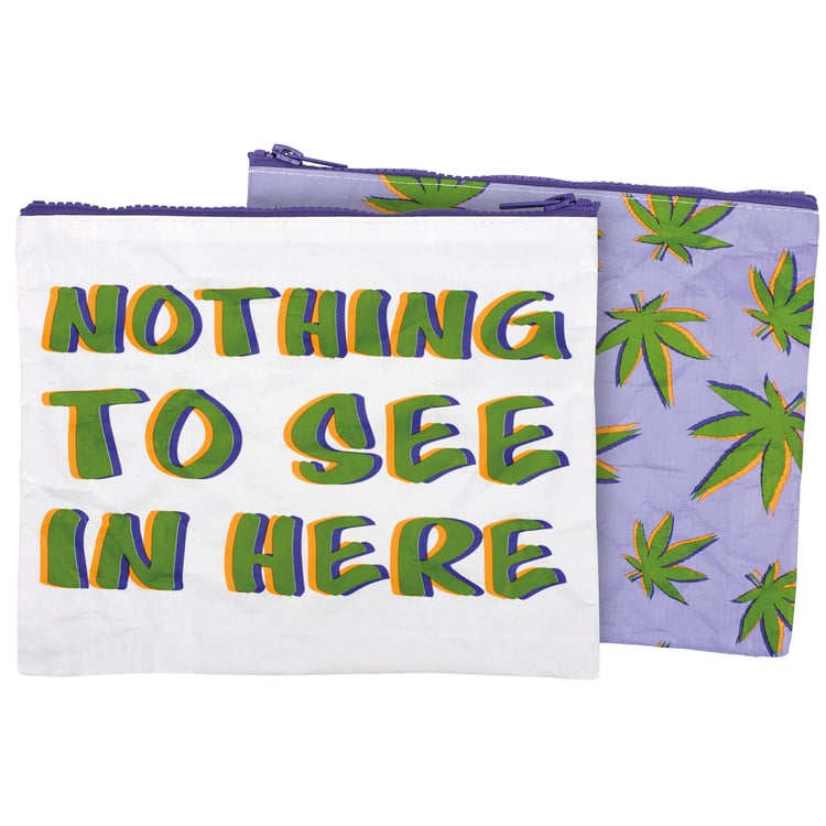 A double-sided zipper pouch displaying a cheeky sentiment that reads "Nothing To See in Here" with a colorful pot leaf pattern on the back. Pouch includes a top zipper closure in a coordinating blue color for easily securing items inside. Questionables zipper pouches are made from eco-friendly post-consumer material and are perfectly sized to tidy up loose items or conceal your stash. Accessories pictured not included. Our Nothing To See In Here zipper pouch is great for gifting and combining functional style with everyday self expression.