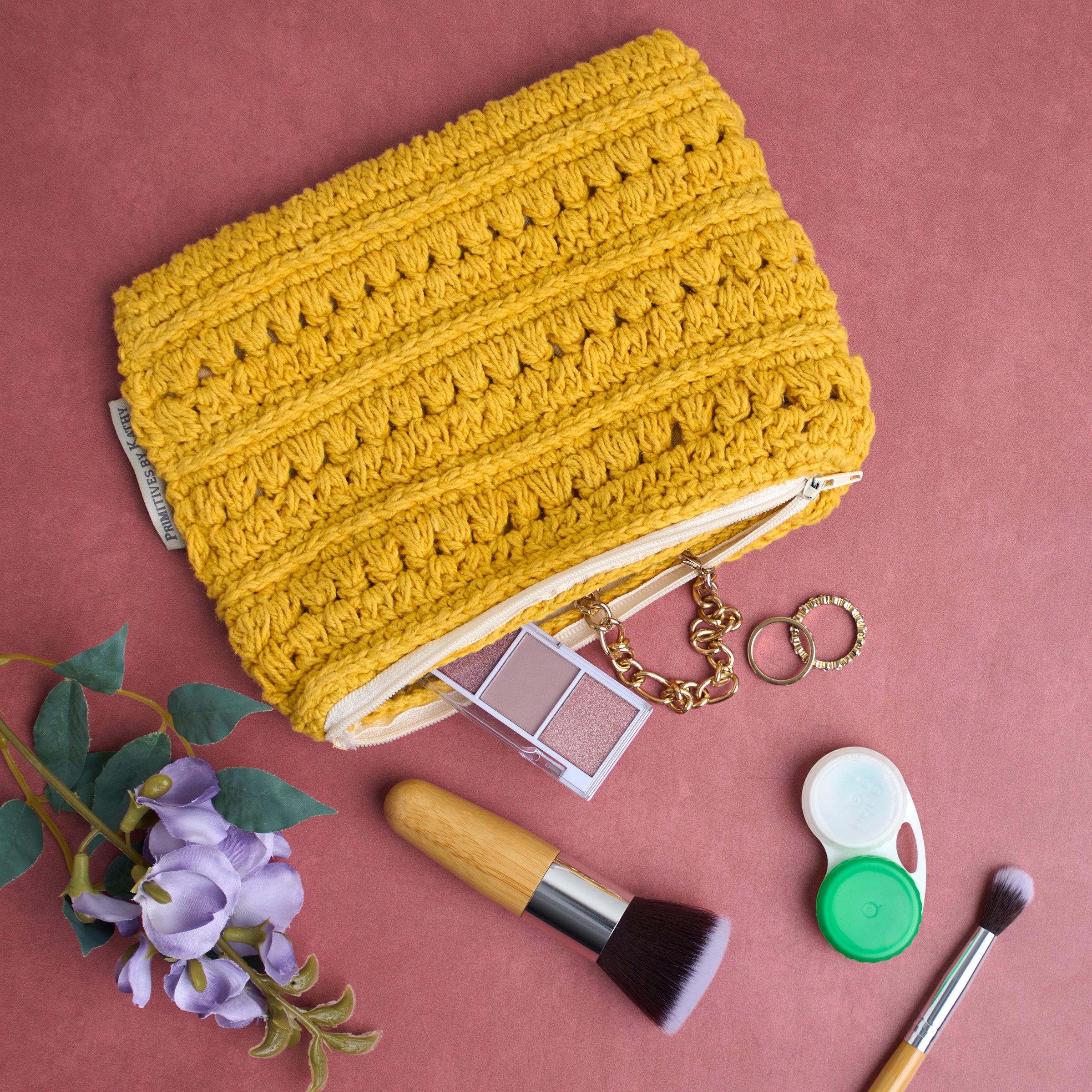 A cotton pouch from our Cottagecore Collection features a saffron color and unique crochet style for the bag design as well as a zipper on top to secure items inside. Our Saffron Crochet zipper pouch includes a fully lined pouch perfect for storing everyday items when on the go. A stylish accessory great for gifting.