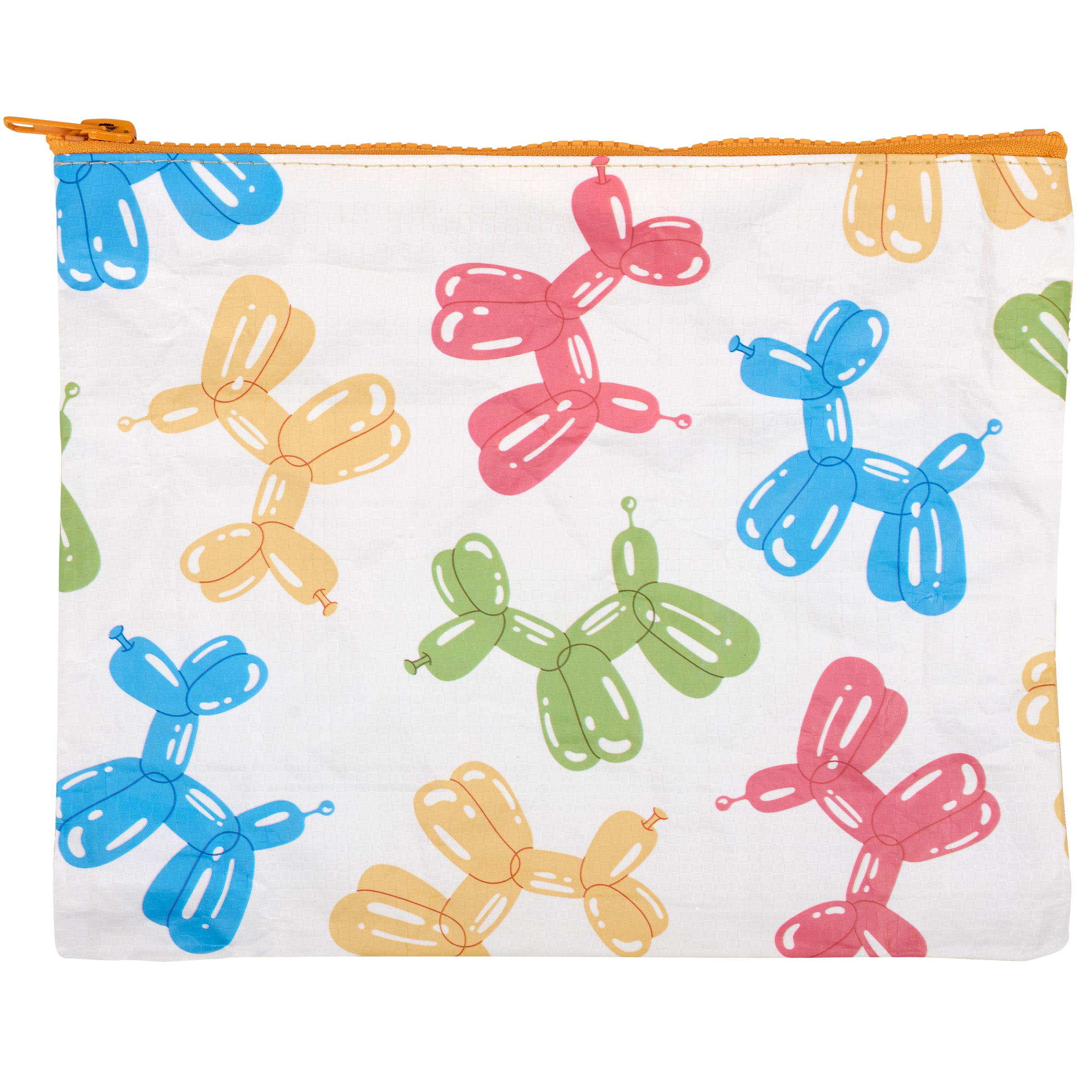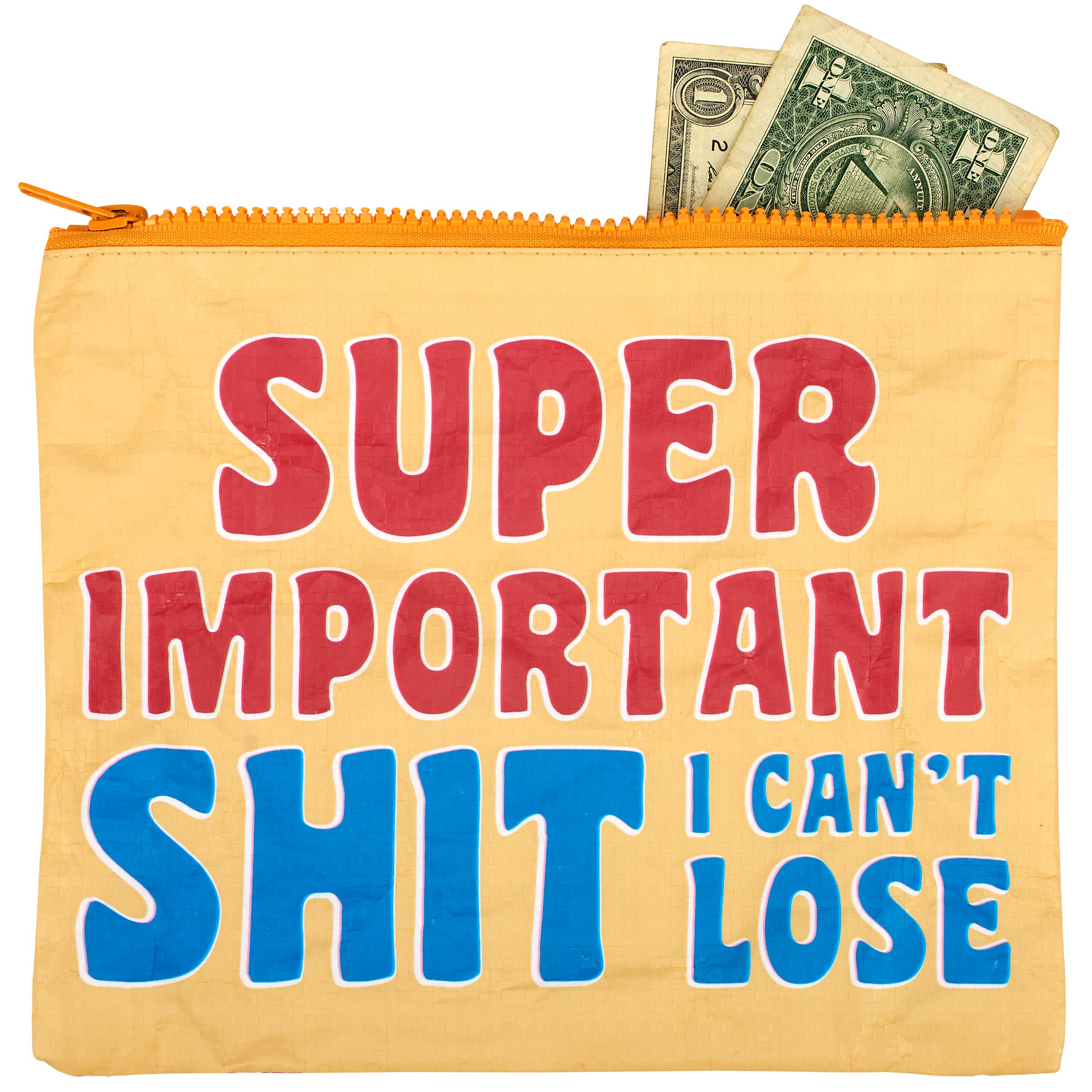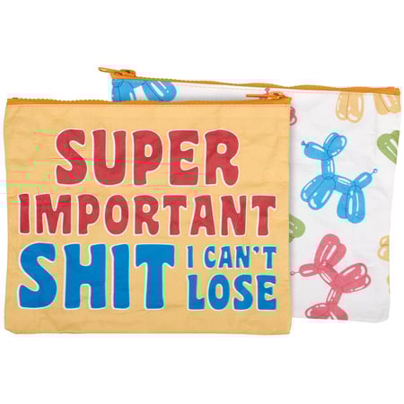 A double-sided zipper pouch displaying a relatable sentiment that reads "Super Important Shit I Can't Lose" with a colorful balloon animal pattern on the back. Pouch includes a top zipper closure in a coordinating orange color for easily securing items inside. Questionables zipper pouches are made from eco-friendly post-consumer material and are perfectly sized to tidy up loose items or organize everyday necessities. Accessories pictured not included. Our Super Important zipper pouch is great for gifting and combining functional style with everyday self expression.