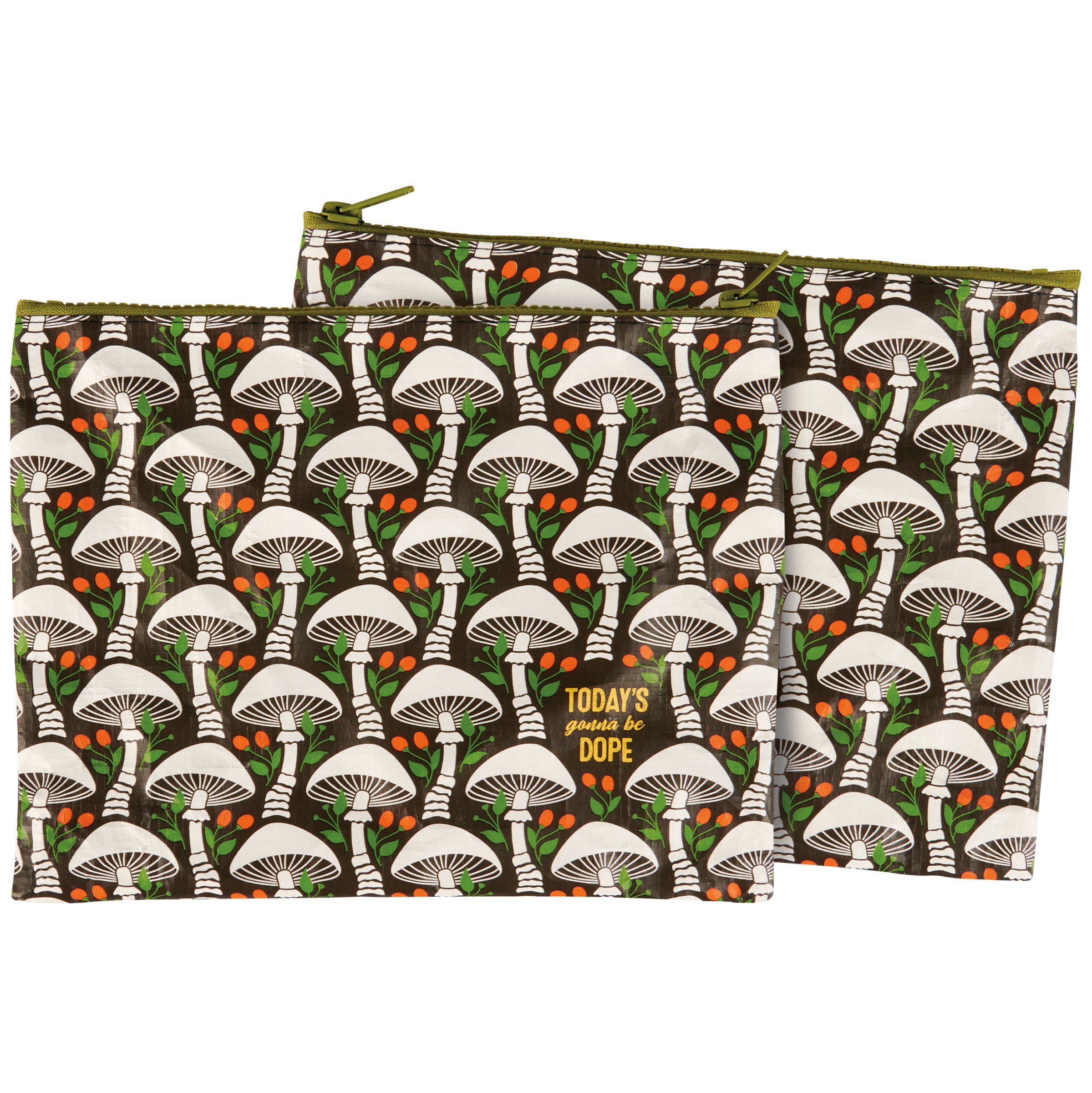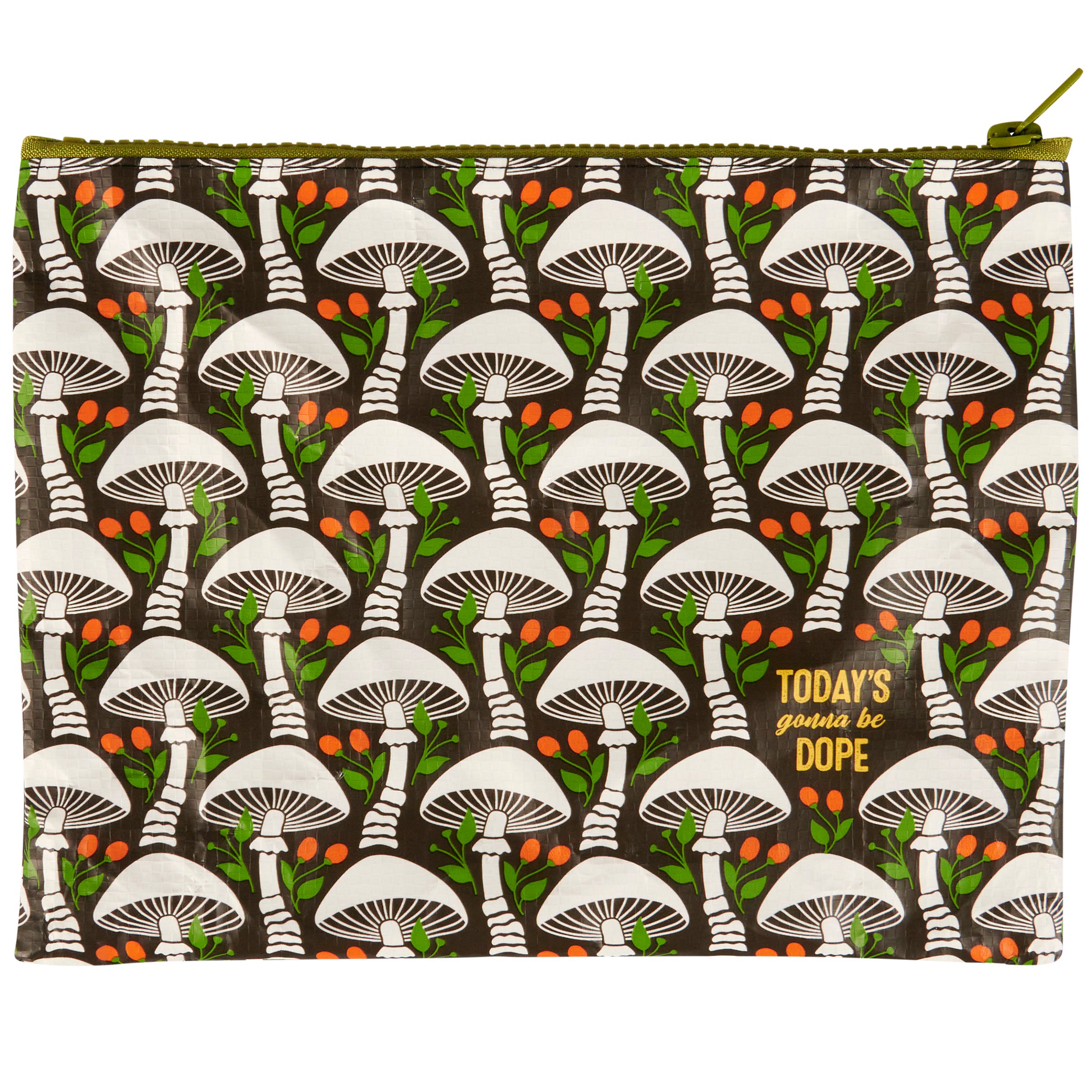 Give anyone that steps into personal space a vibe check with this double-sided zipper pouch displaying a relaxing mushroom pattern and a chill sentiment that reads "Today's Gonna Be Dope." Our stylish pouch includes a top zipper closure in coordinating green color to easily secure a stash, some fun money, or whatever needs protecting. Accessories pictured not included. Questionables zipper wallets are made from eco-friendly post-consumer material. Our Today's Gonna Be Dope zipper pouch is an everyday accessory with down-to-earth style perfect for organization on the go.