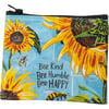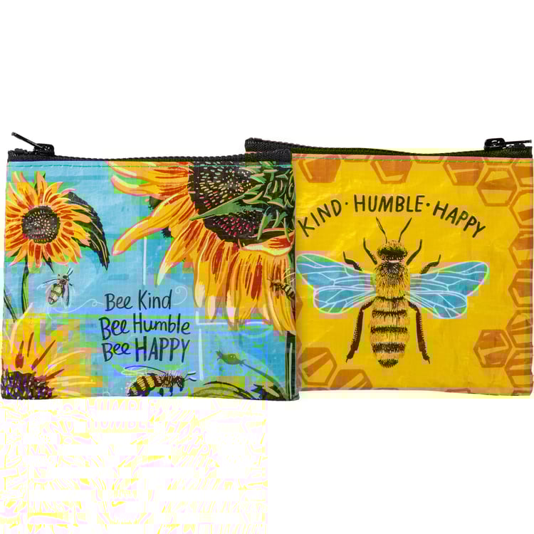 Made of post-consumer material, this double-sided zipper wallet lends a front "Bee Kind Bee Humble Bee Happy" sentiment with peppy sunflower and bee designs, reverse "Kind Humble Happy" sentiment with bee illustration, and a top zip closure. Complements well with other pieces in collection to create a vibrant display!
