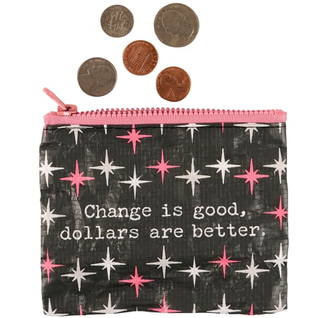 A double-sided zipper wallet from our Trash Talk By Annie Collection flaunting a classy pink and gray retro pattern with a humorous sentiment that reads "Change Is Good, Dollars Are Better." Funny wallet includes a top zipper closure in coordinating pink color for easily securing items inside. Our Change Is Good zipper wallet is perfectly sized to hold daily items. Accessories pictured not included. A fun vintage style accessory made from eco-friendly post-consumer material and perfect for stylish organization when on the go.