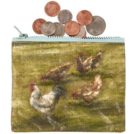 A double-sided zipper wallet from our Farmhouse Collection displaying farm chickens in a field. Design is replicated from original artwork painted onto burlap canvas, giving the art a unique depth and texture. Includes a top zipper closure in coordinating blue color for easily securing items inside. Our Chickens zipper wallet is perfectly sized to hold daily on the go items. Accessories pictured not included. Made from eco-friendly post-consumer material. A farm-themed everyday accessory perfect for on the go organization.