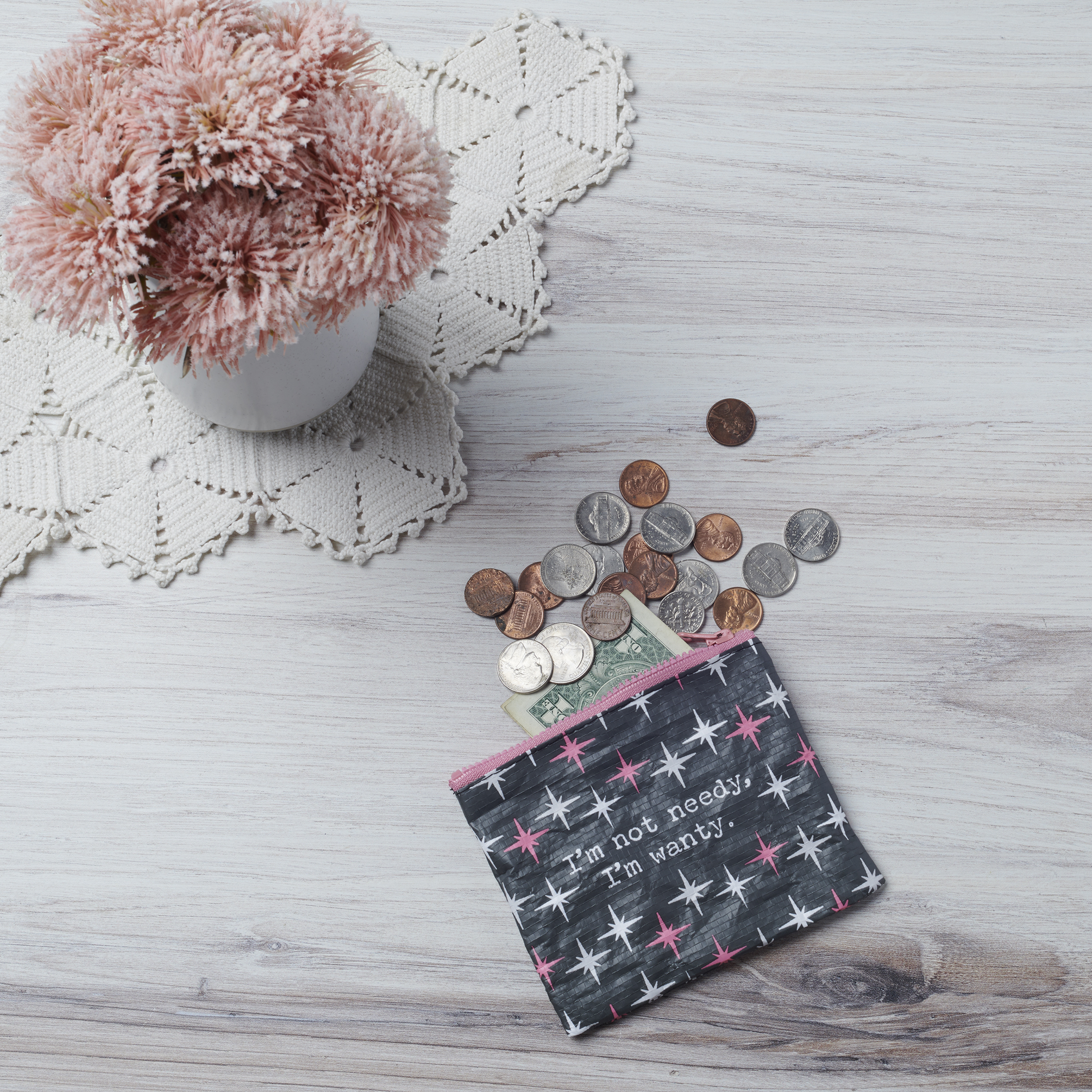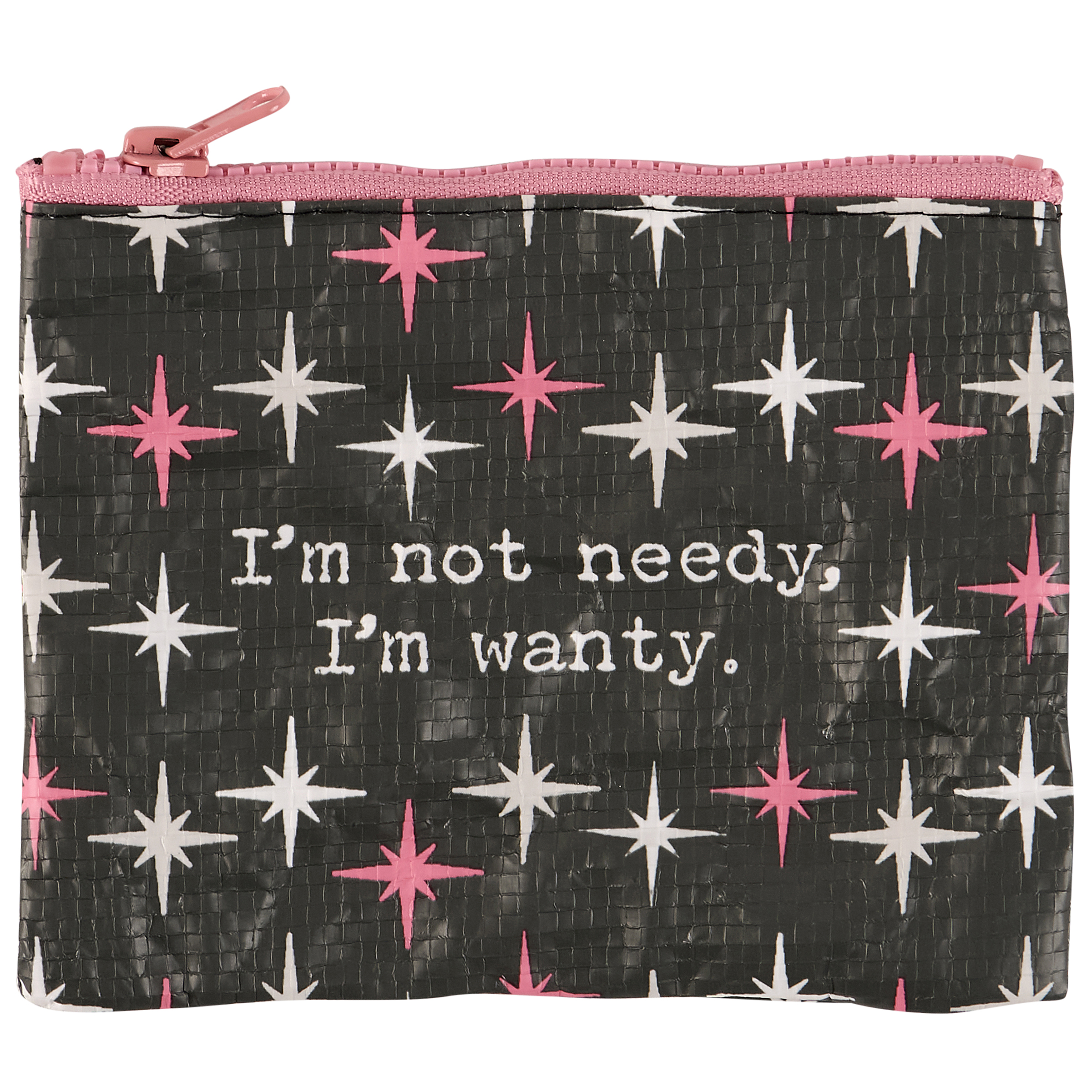 A double-sided zipper wallet from our Trash Talk By Annie Collection flaunting a classy pink and gray retro pattern with a humorous sentiment that reads "I'm Not Needy, I'm Wanty." Funny wallet includes a top zipper closure in coordinating pink color for easily securing items inside. Our I'm Wanty zipper wallet is perfectly sized to hold daily items. Accessories pictured not included. A fun vintage style accessory made from eco-friendly post-consumer material and perfect for stylish organization when on the go.