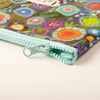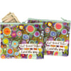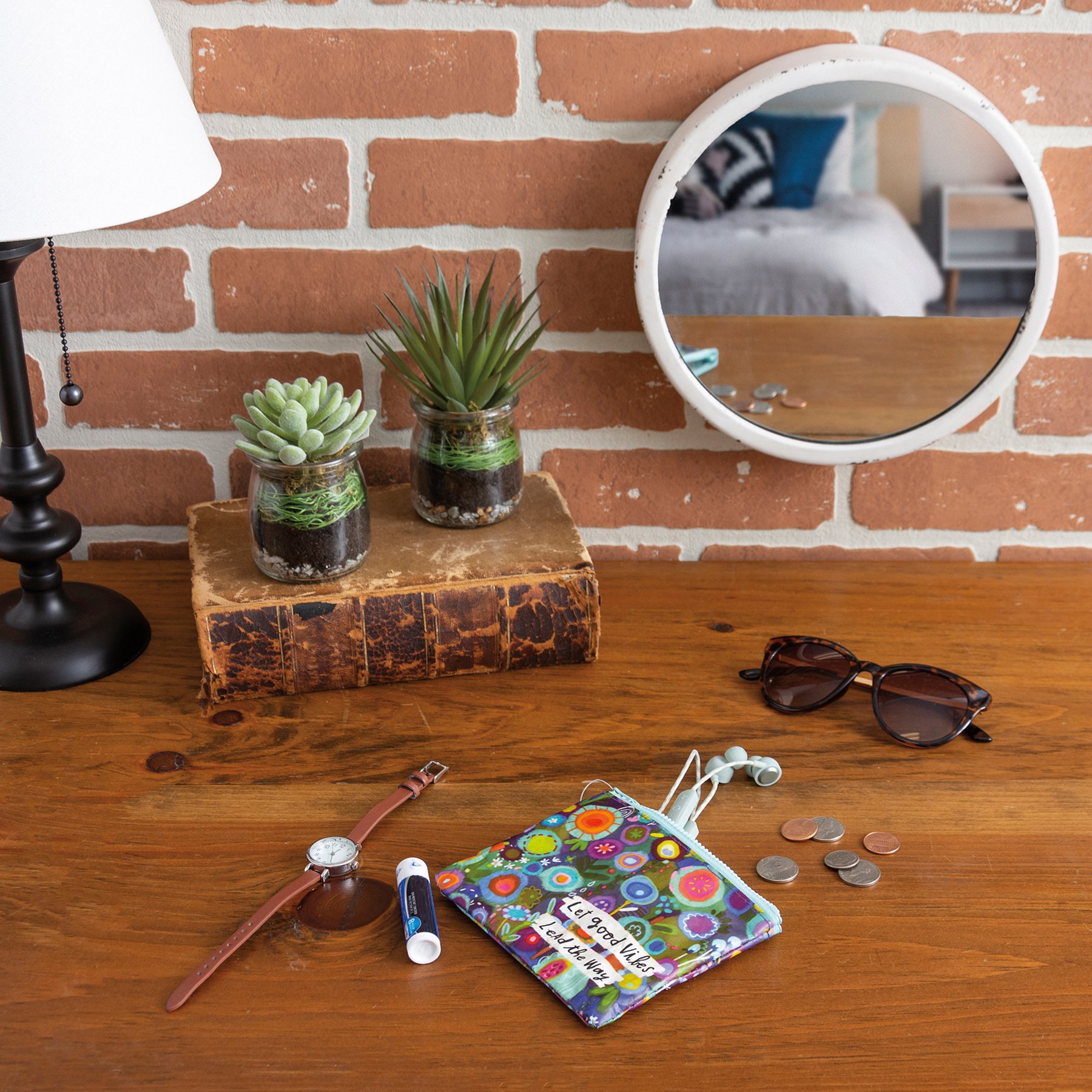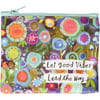 Made of post-consumer material, this double-sided zipper wallet features vibrant floral designs with "Let Good Vibes Lead The Way" sentiment. Contains a top zip closure.