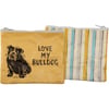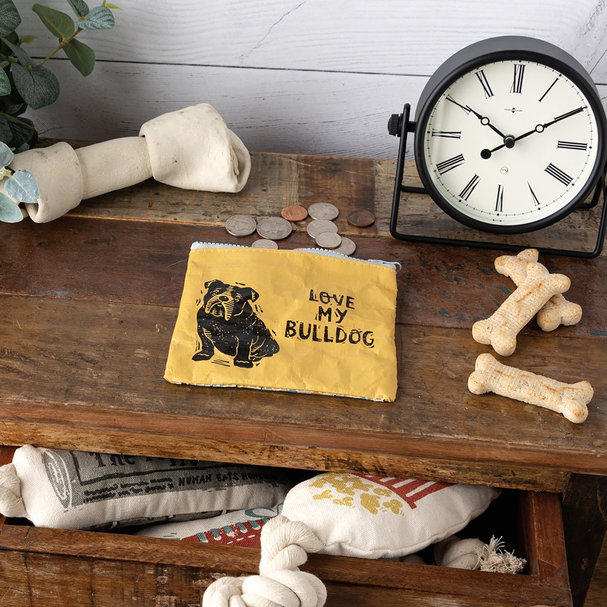 Made of post-consumer material, this double-sided zipper wallet from our Pet Collection features a block print bulldog design with "Love My Bulldog" sentiment on front. Reverse side of the Love My Bulldog zipper wallet features coordinating stripe design.
