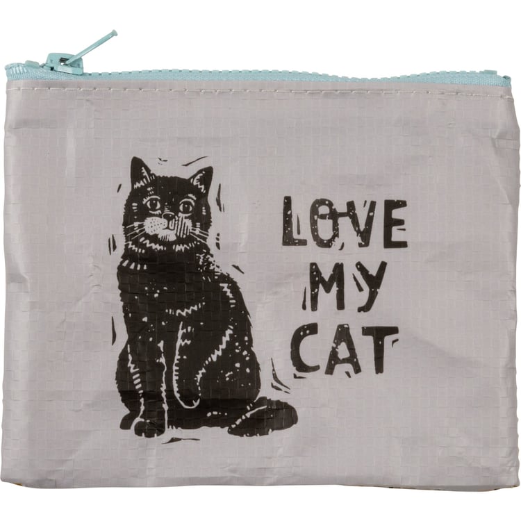 A double-sided zipper wallet from our Pet Collection displaying a fun design of a house cat replicated from original block print style art with a heartwarming pet inspired sentiment that reads "Love My Cat." Colorful design features coordinating stripe pattern on the back. Cat wallet includes a top zipper closure in coordinating blue color for easily securing items inside. Our Love My Cat zipper wallet is made from eco-friendly post-consumer material and is perfectly sized to hold daily on the go items. Accessories pictured not included. A lovely pet-themed everyday accessory perfect for on the go organization.