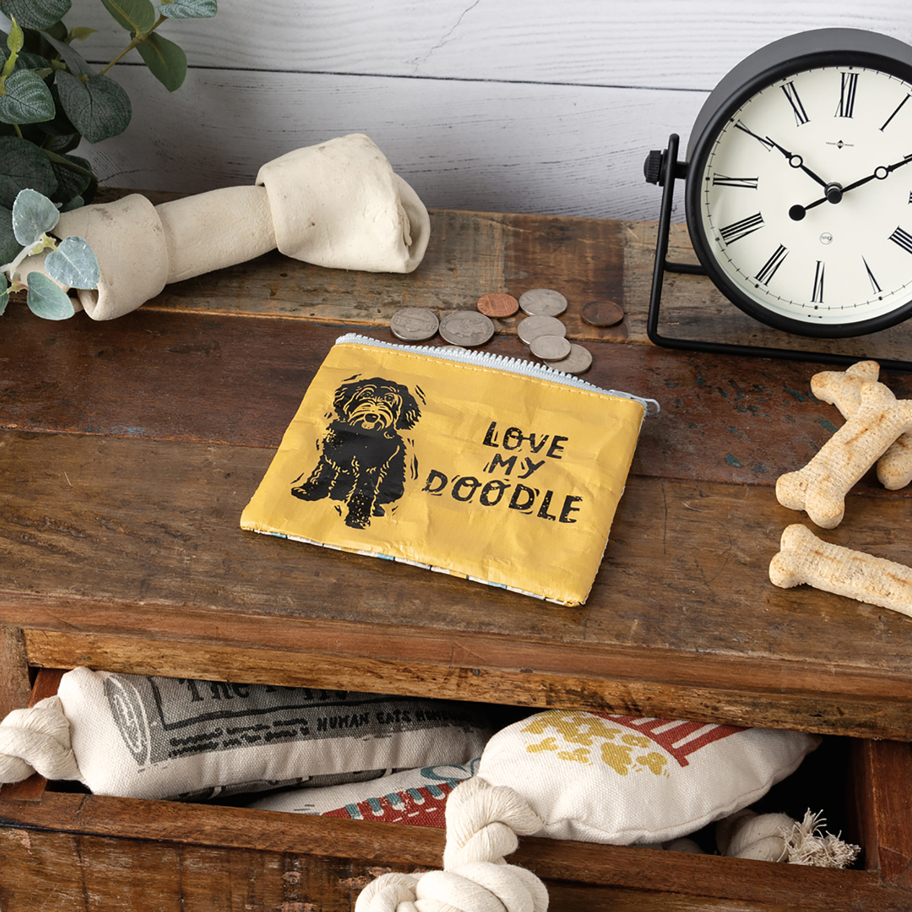 Made of post-consumer material, this double-sided zipper wallet from our Pet Collection features a block print doodle design with "Love My Doodle" sentiment on front. Reverse side of the Love My Doodle zipper wallet features coordinating stripe design.