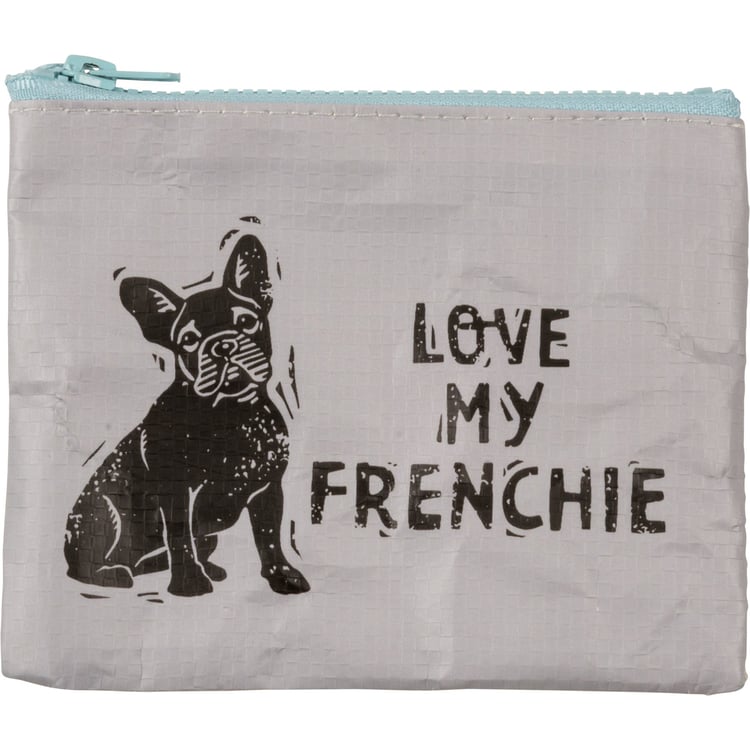 Made of post-consumer material, this double-sided zipper wallet from our Pet Collection features a block print french bulldog design with "Love My Frenchie" sentiment on front. Reverse side of the Love My Frenchie zipper wallet features coordinating stripe design.