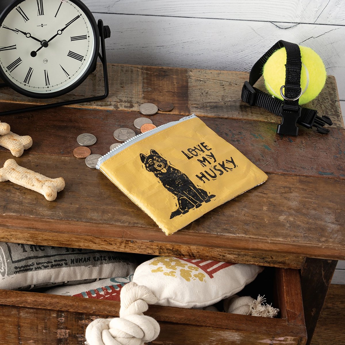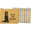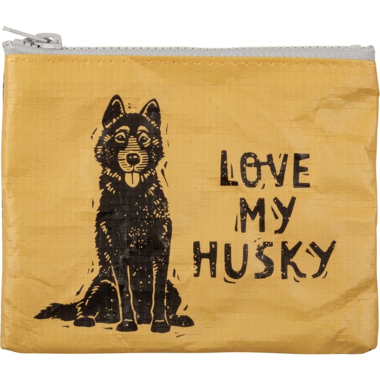 Made of post-consumer material, this double-sided zipper wallet from our Pet Collection features a block print husky design with "Love My Husky" sentiment on front. Reverse side of the Love My Husky zipper wallet features coordinating stripe design.