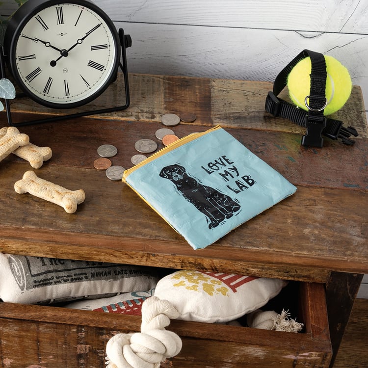 Made of post-consumer material, this double-sided zipper wallet from our Pet Collection features a block print labrador retriever design with "Love My Lab" sentiment on front. Reverse side of the Love My Lab zipper wallet features coordinating stripe design.