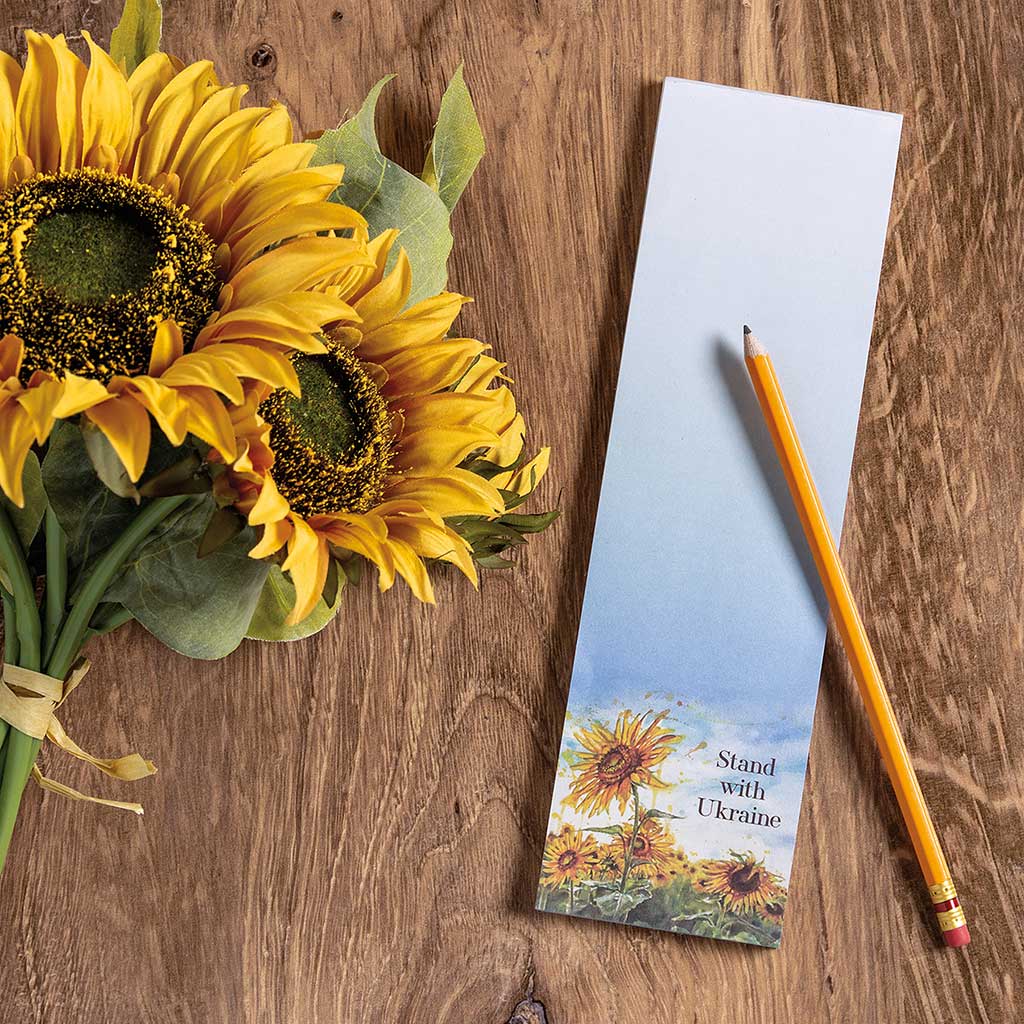 A list notepad featuring a watercolor sunflower field design and a "Stand With Ukraine" sentiment. As one of our Benefit Items, 100% of the proceeds from the sales of this item will be donated to the Ukraine Crisis Relief Fund by Global Giving to support Ukranian refugee relief programs. Our Stand With Ukraine list notepad contains 60 pages and a strong back magnet. Made in the USA.We had set an initial donation goal of $100,000. Thanks to our amazing wholesale and retail customers - we are well on our way to achieving our goal. "Thank You" to everyone who has already showed their support!